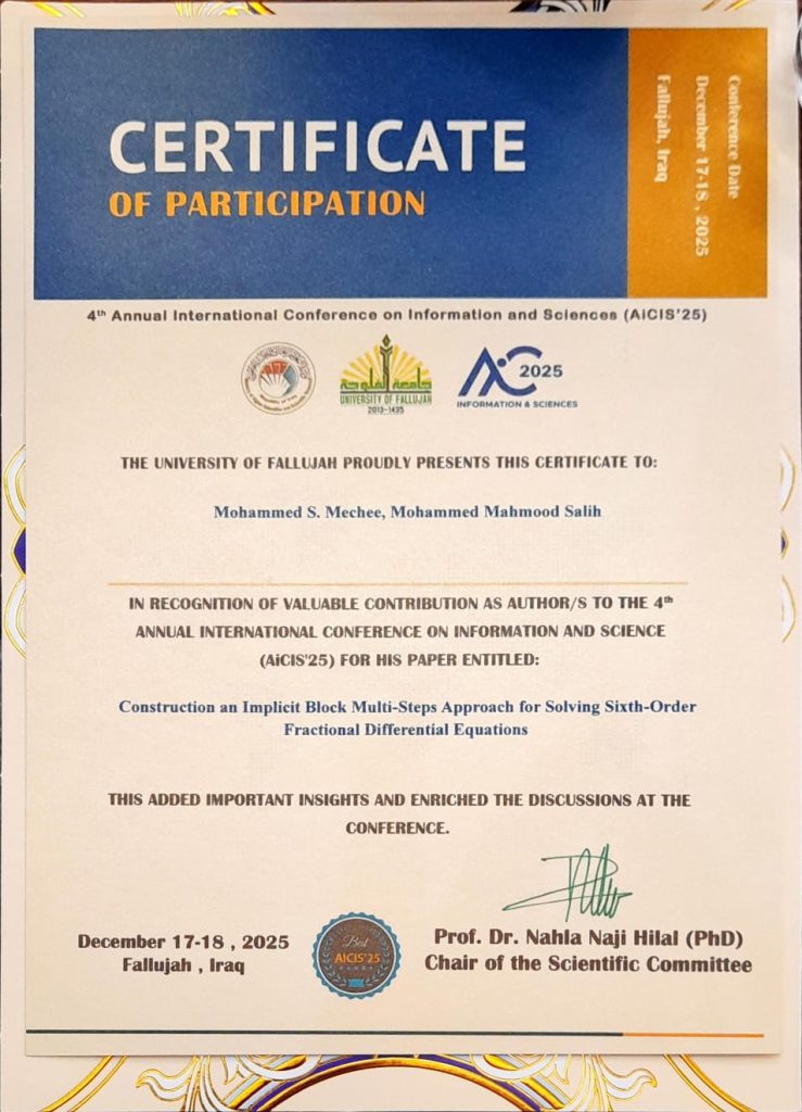 Dr. Mohammed Mahmoud Saleh, a lecturer in the Software Department at the College of Information Technology, participated in the 4th International Conference on Information and Science (AiCIS’25), held at the University of Fallujah from December 17-18, 2025. The conference included researchers and academics from local and international universities.