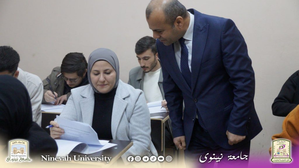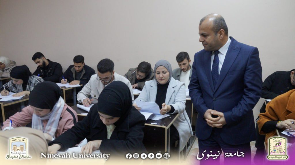 The Vice President for Scientific Affairs, Professor Dr. Jaafar Ramadan, inspected the progress of the fall semester exams for the 2025-2026 academic year at the College of Information Technology. He was received by the Dean of the College, Professor Dr. Manar Younis Kashmoula, and the Head of the Computer Networks and Internet Department, Dr. Azhar Sabah Abdul Aziz, and the Head of the Software Department, Dr. Ali Mohsen Ahmed.