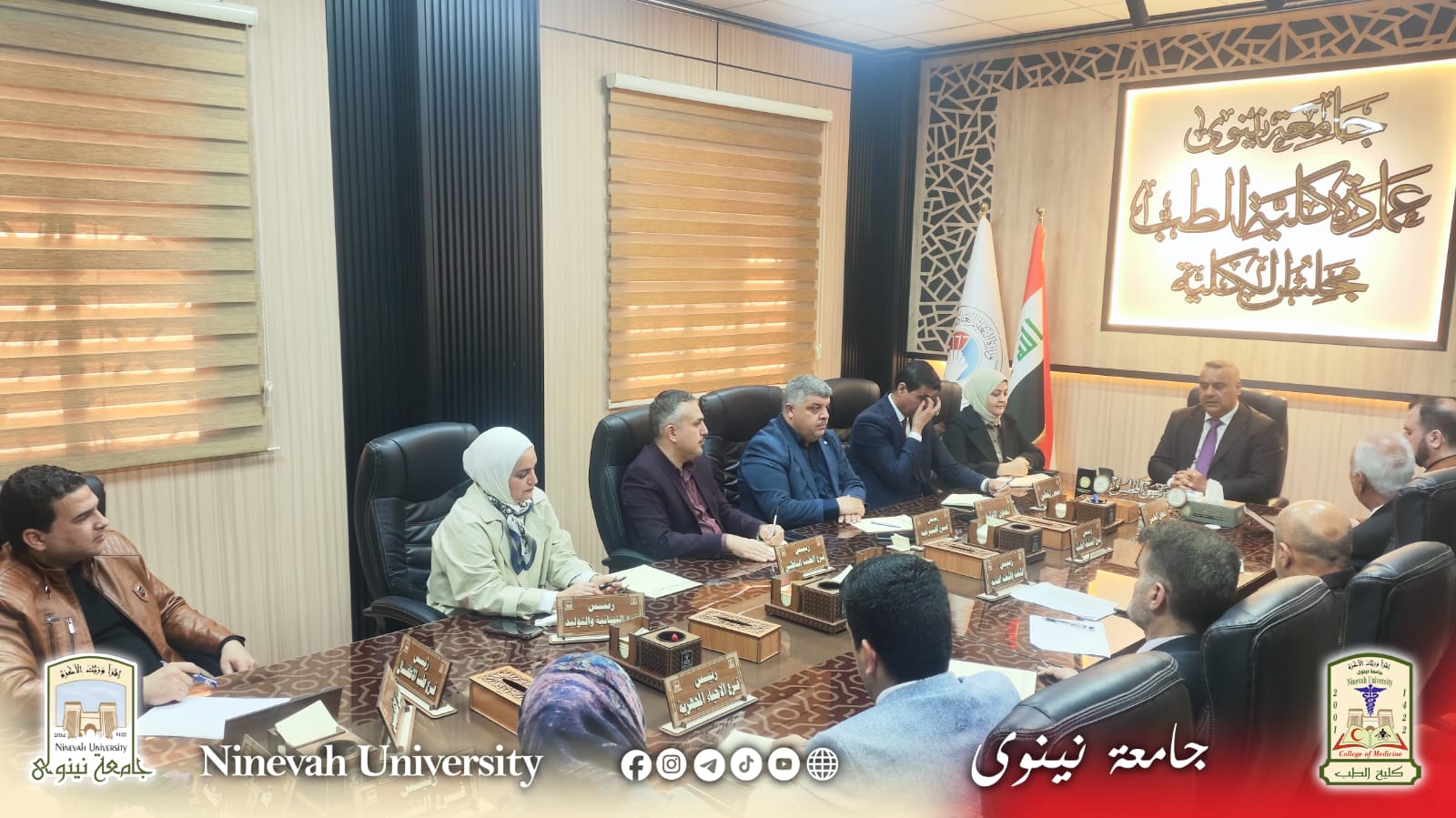 جامعة نينوى انعقاد جلسة مجلس الكلية بحضور الأستاذ الدكتور أسامة إسماعيل المشهداني رئيس جامعة نينوى، وبمشاركة السيد عميد الكلية الأستاذ المساعد الدكتور مؤمن جنيد الدبوني وأعضاء المجلس.وتناول الاجتماع ملف الاعتمادية بوصفه أحد المحاور الاستراتيجية لتطوير الكلية، حيث جرى بحث متطلبات الاعتماد الأكاديمي وآليات الارتقاء بجودة التعليم الطبي، بما ينسجم مع المعايير الوطنية والدولية.كما تطرّق المجلس إلى سبل تعزيز البيئة التعليمية وتحسين المخرجات الأكاديمية، بما يحقق تطلعات الكلية في الوصول إلى مستويات متقدمة من الجودة والتميّز.وتأتي هذه الخطوة في إطار حرص كلية الطب على ترسيخ معايير الاعتمادية وضمان تقديم تعليم طبي رصين يواكب التطورات الحديثة.