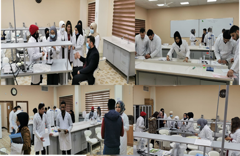2- مختبر الفسلجة (Laboratory of Physiology): يُعد مختبر الفسلجة أحد المختبرات الحيوية لطلبة كلية الصيدلة، حيث يوضح لهم مفهوم التوازن الداخلي للجسم من خلال وظائف الأعضاء. يتم فيه تدريب عملي شامل لطلبة المرحلة الثانية على فحوصات الدم مثل CBC وESR وBlood Groups وBT & CT وغيرها، بالإضافة إلى دراسة وظائف الأعضاء البشرية باستخدام أجهزة حديثة مثل جهاز فحص الجهاز التنفسي Spirometer وجهاز تخطيط القلب ECG، وكذلك قياس العلامات الحيوية مثل ضغط الدم ومستويات السكر في الدم ودرجة حرارة الجسم ومعدل النبض ونسبة الأكسجين في الدم.