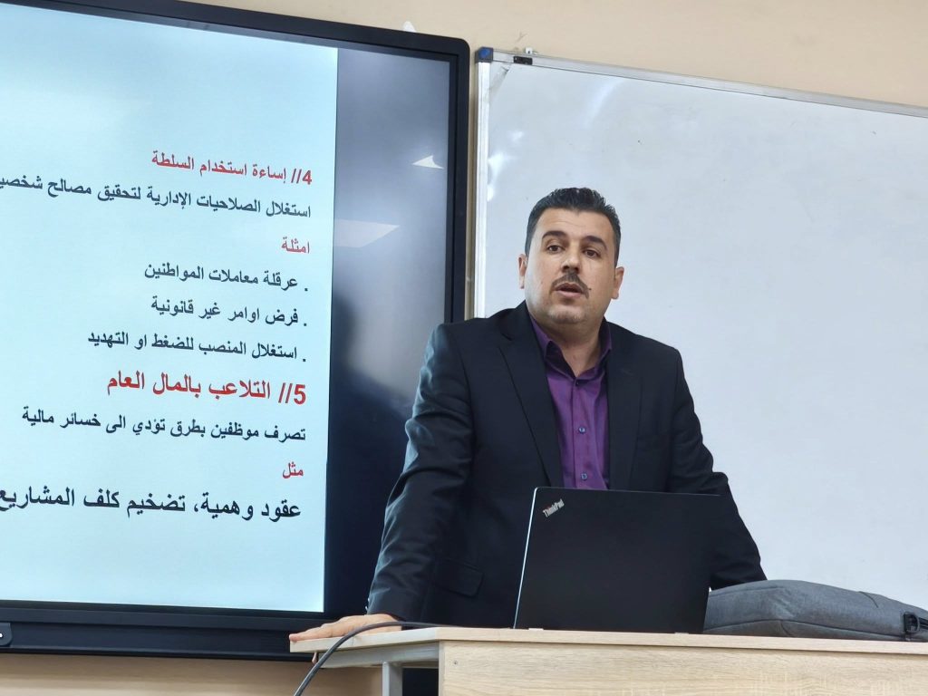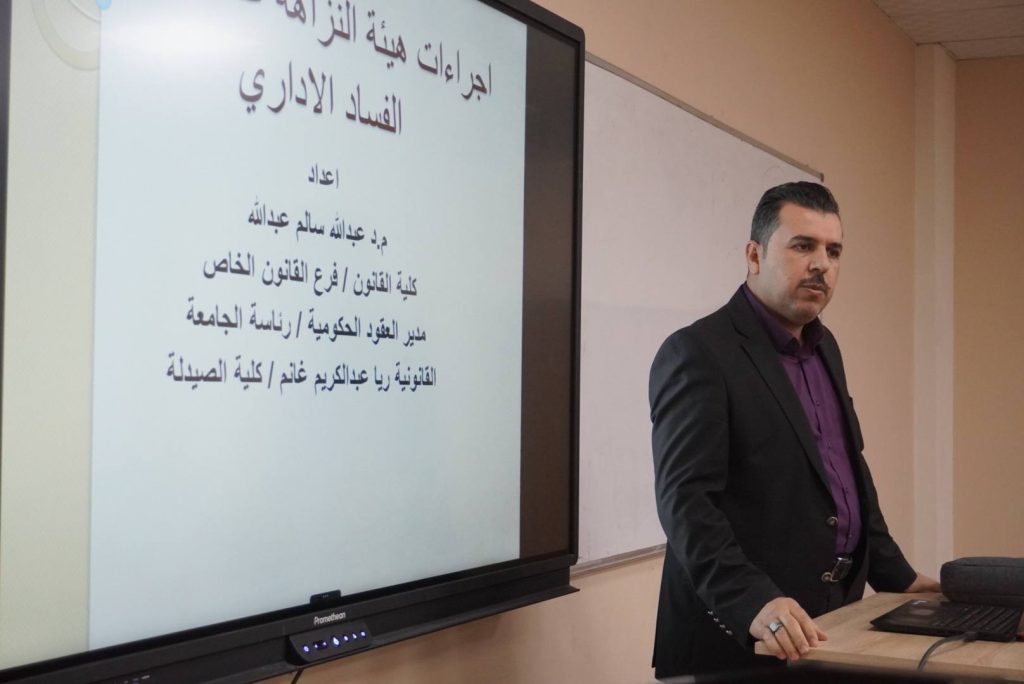 حيث تضمّنت الورشة شرحًا وافيًا للإجراءات القانونية المتبعة من قبل هيئة النزاهة، وآليات الإبلاغ عن حالات الفساد الإداري، وأهمية الالتزام بالضوابط القانونية بما يعزز مبادئ الشفافية والنزاهة المؤسسية مستهدفة منتسبي وطلبة الكلية،