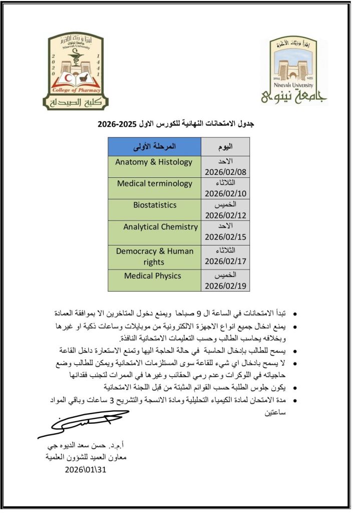 ادناه جدول الامتحانات النظرية لنهاية الكورس الأول للمرحلة ( الاولى) للعام الدراسي 2025- 2026 والتي سوف تنطلق في يوم الأحد المصادف 8-2-2026