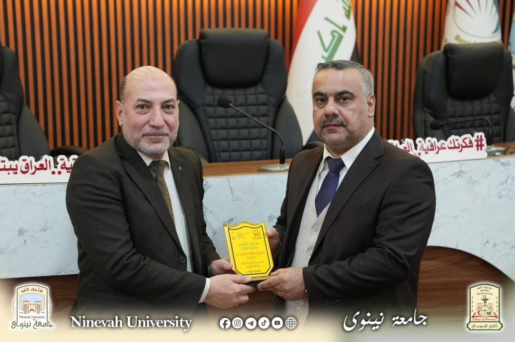 At the conclusion of the events, participating contributors and supporters were honored in recognition of their efforts in ensuring the success of this pioneering scientific event. His Excellency the University President, Professor Dr. Osama Ismail Al-Mashhadani, honored the Dean of the College of Pharmacy, Assistant Professor Dr. Maysar Al-Qoutji, by awarding him the Shield of Excellence, in appreciation of the College’s active role in supporting the innovation ecosystem and advancing the entrepreneurial journey within the University.