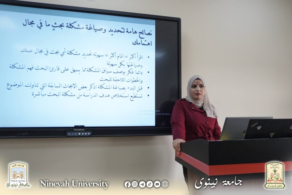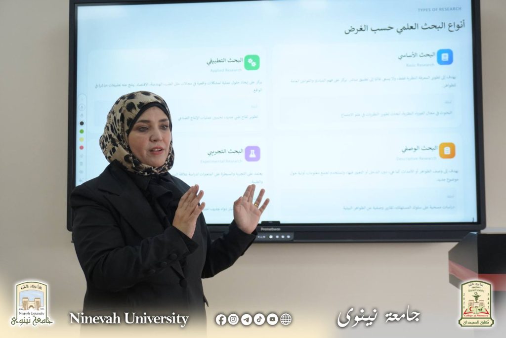 As part of its strategic plan aimed at enhancing research skills and refining students’ scientific competencies, and within the activities of the Qualification and Employment Unit, the College of Pharmacy at the University of Nineveh organized a scientific workshop on Thursday, 26 February 2026, entitled “Research Methodology for Students.” This initiative reflects the College’s commitment to preparing a qualified academic generation equipped with rigorous research tools and capable of competing in scholarly forums.