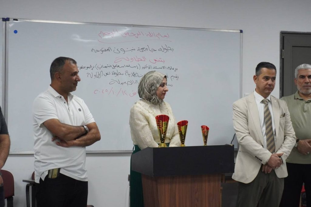 Under the patronage of the President of the University of Nineveh, Prof. Dr. Osama Ismail Al-Mashhadani, and under the direct supervision of the Dean of the College of Pharmacy, Asst. Prof. Dr. Maysar Mohammed Ali Al-Qutji, the College of Pharmacy hosted the Table Tennis Championship for students of the University of Nineveh, organized by the Department of Student Affairs at the University Presidency in collaboration with the Student Activities Units in the colleges. The event took place on Sunday, October 12, 2025, at the premises of the College of Pharmacy.