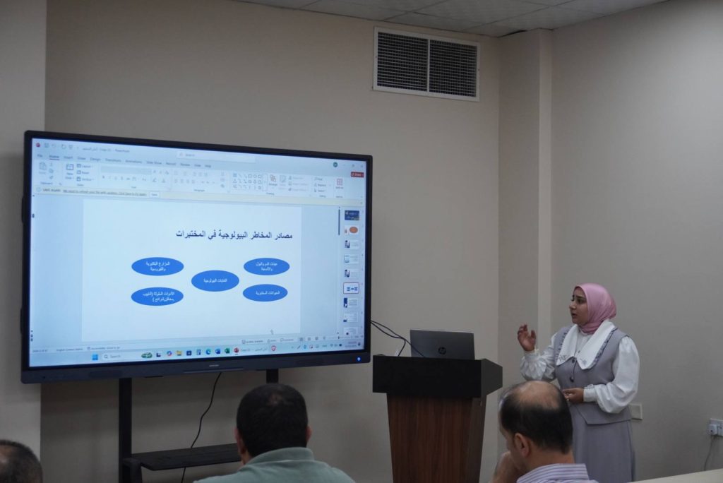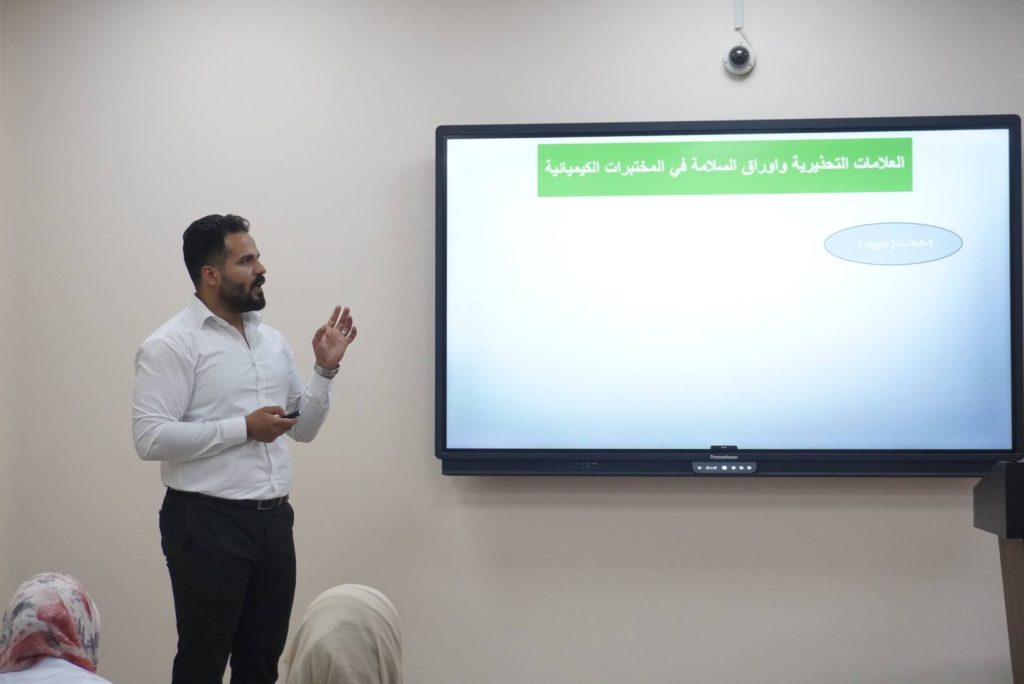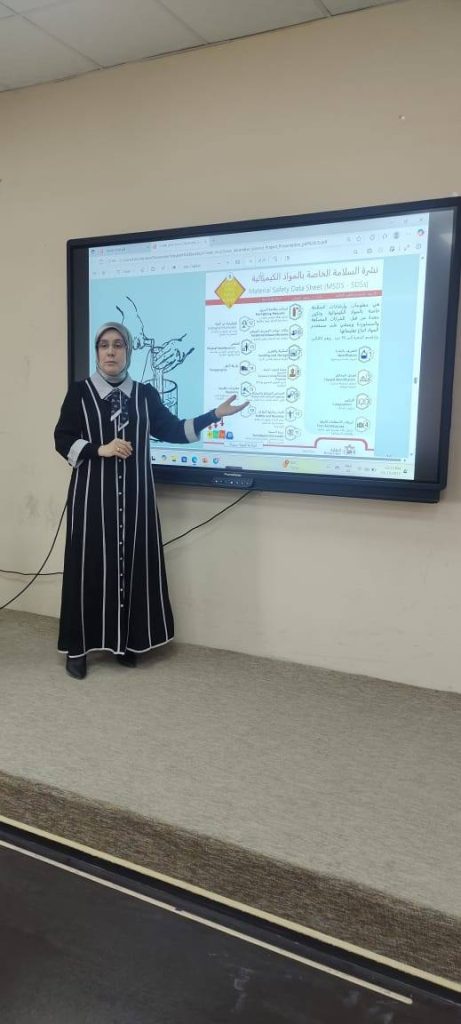 The course sessions were delivered by Asst. Lecturers Ahmed Abdulsalam, Hiba Hatem, and Rafah Ameer, and included both theoretical and practical components covering a variety of topics related to general and chemical safety in laboratories. The lectures focused on the major hazards associated with chemical substances and safe handling procedures, in addition to reviewing the Occupational Safety and Health Administration (OSHA) requirements and the Material Safety Data Sheets (MSDS) system, in accordance with internationally recognized standards.