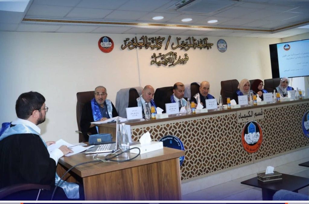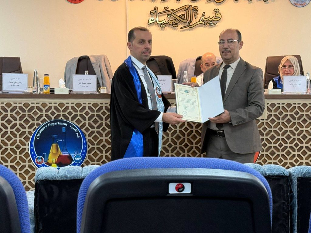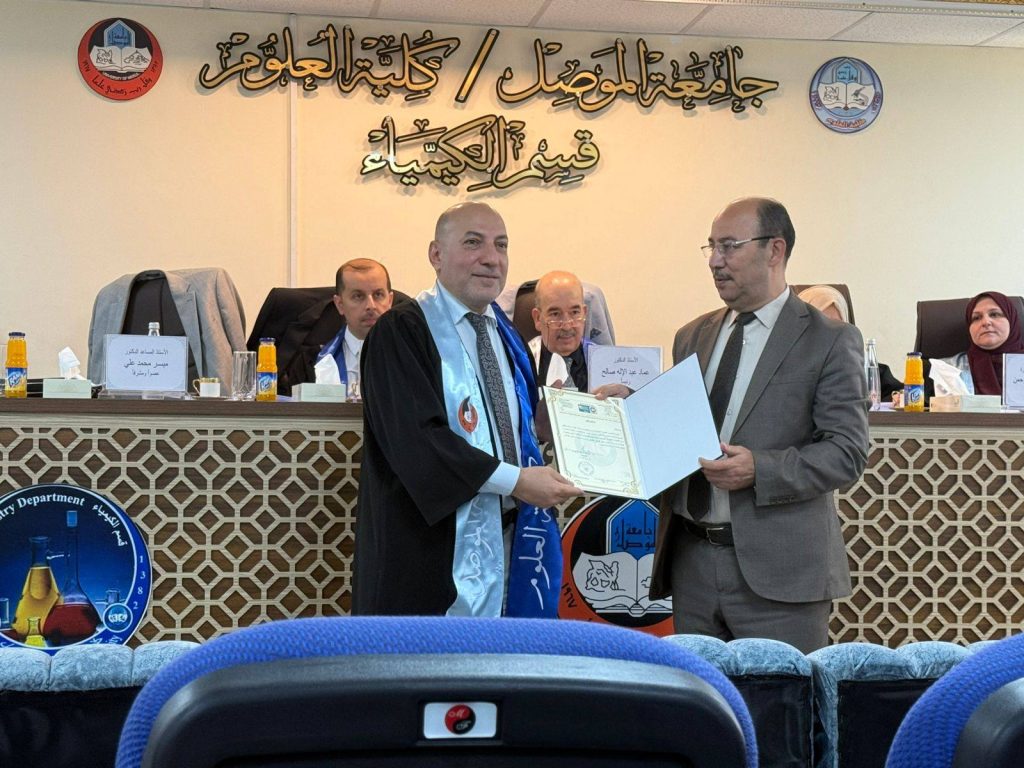 Within the framework of scientific and academic collaboration between our University and the University of Mosul, the Dean of the College of Pharmacy, Asst. Prof. Dr. Maisar Al-Qutji, participated as a supervisor in the doctoral dissertation entitled “The Effect of Certain Pharmaceutical Preparations on the Formation of Wormlike Micelles and the Measurement of Their Stability”, submitted by the doctoral candidate Bashar Zuheir Abdulhamid Ismail. The defense was held at the Department of Chemistry, College of Science, University of Mosul, on Wednesday, September 24, 2025.