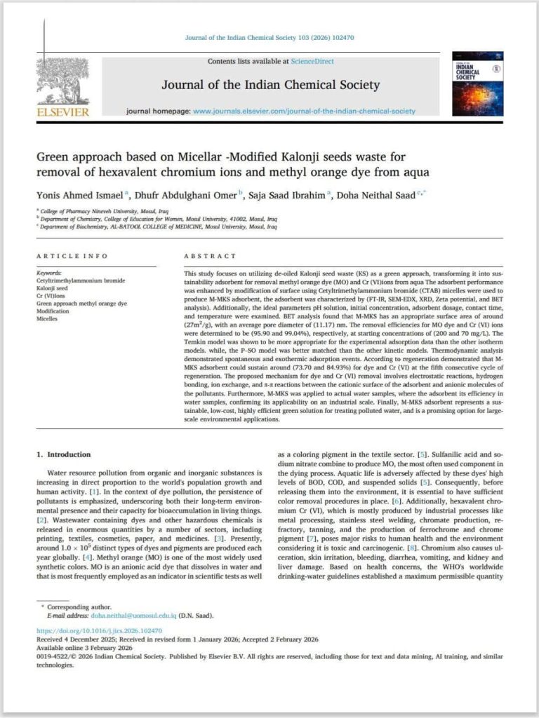 Dr. Younis Ahmed Ismail and Asst. Lect. Saja Saad Ibrahim have published a scientific research article entitled: “Green Approach Based on Micellar-Modified Kalonji Seeds Waste for the Removal of Hexavalent Chromium Ions and Methyl Orange Dye from Aqueous Solutions” The study was published in the Journal of the Indian Chemical Society, issued by the international publishing house Elsevier.